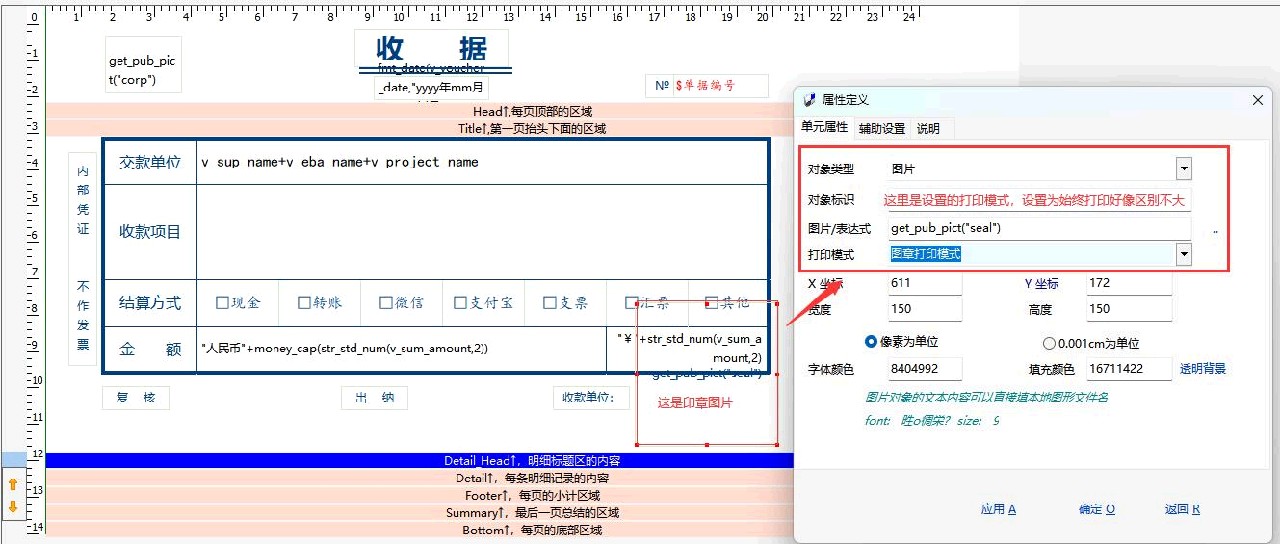我的建议是在打印菜单中不再设置“有图片时按图形模式打印”,仅在图片属性中进行设置,如果图片的属性设置为“图章打印模式”,则仅对该图片生效,打印时其他内容都按正常模式打印。设置为图章打印模式后,该部分内容不会遮挡有重叠的其他内容。