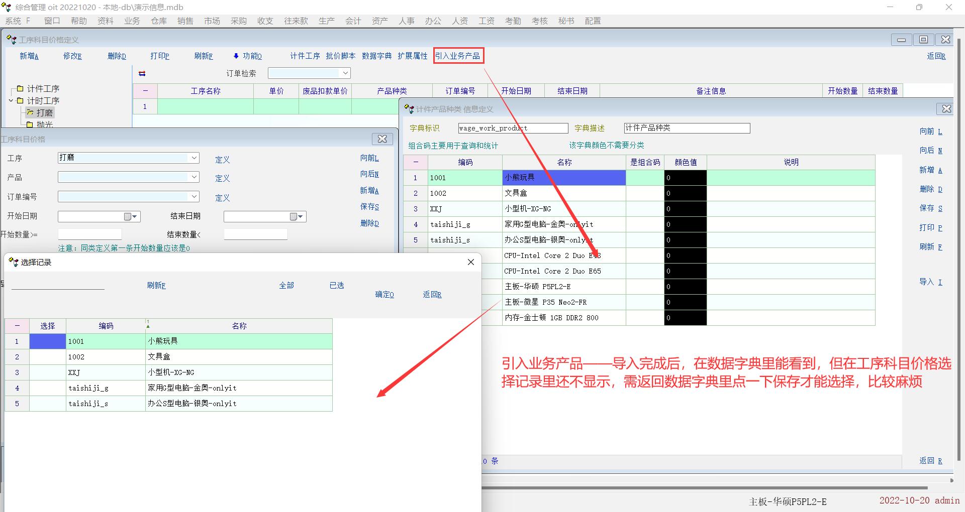 1.引入业务产品--导入完成后,在数据字典里能看到,但在工序科目价格选择记录里还不显示,好像返回数据字典里点一下保存才能触发保存,才能选择,比较麻烦;