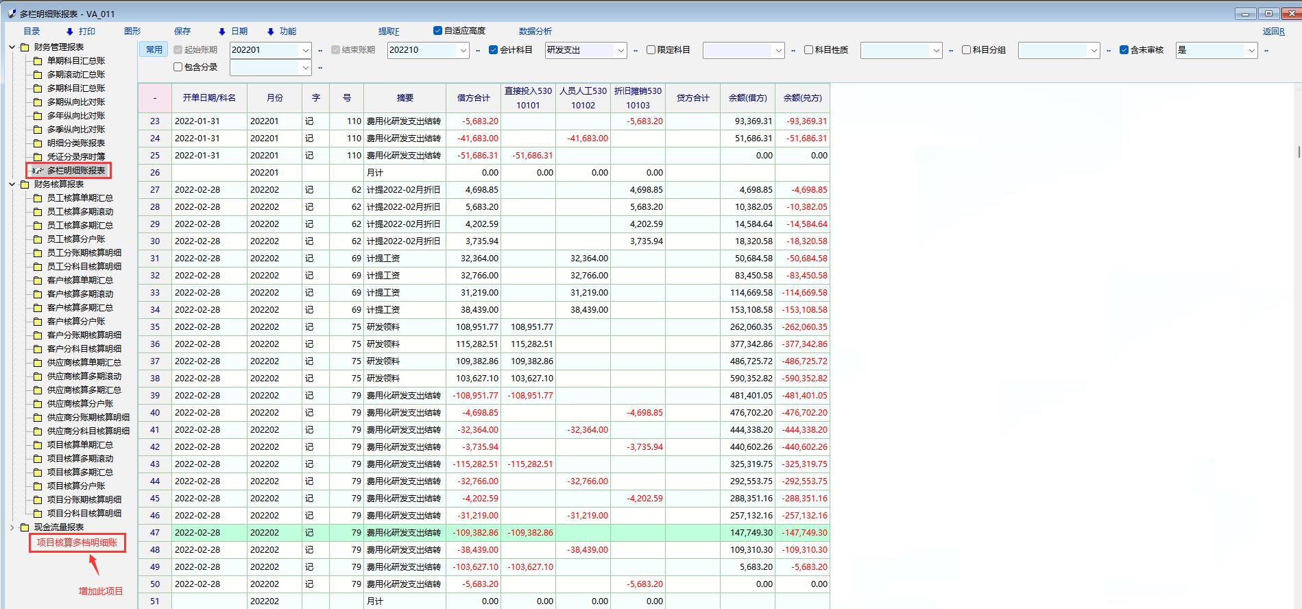 公司申请了高新企业认证,需要研发项目多栏明细报表,但是系统中仅有多栏明细账报表,没有相关核算项目的多栏明细报表,希望能够把核算的多栏明细报表增加上。