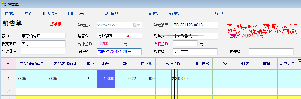 如图,物资单据中增加了结算企业后,显示的账务信息是结算企业的账务信息而不是销售(采购)客户的账务信息。对此应该进行优化:同时分开显示销售(采购)客户的账务信息和结算企业的账务信息。