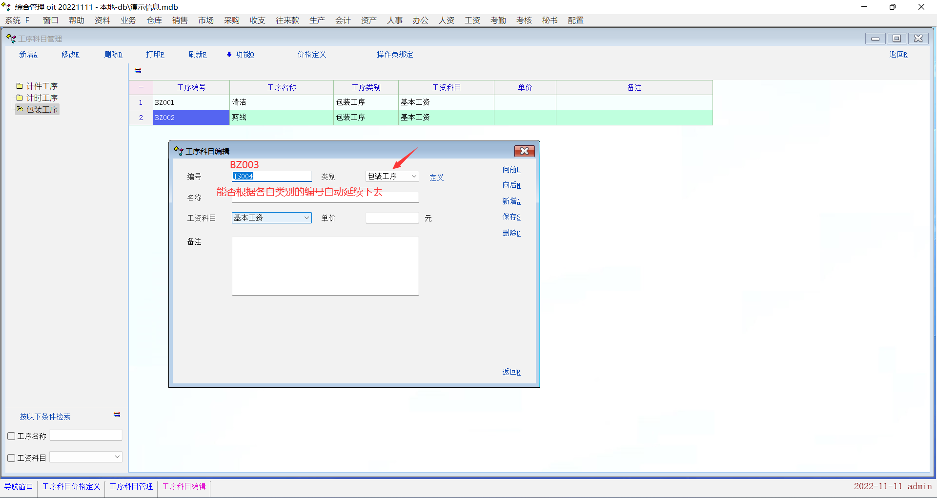 如:计件工序 编码规则 JJ001……    计时工序 编码规则 JS001……   包装工序 编码规则 BZ001……   ; 单独做计件工序或计时工序时编号可以顺延下去,当返回来增加计件工序或包装工序类别的工序时都默认成 JS004(计时类别编号与要新增类别不符);没有按此类别已编的号顺延下去,要看编到那个号了再手动改下去,后面来新增的工序都要这样改,比较麻烦;如果按类别来记忆编下去就方便很多;