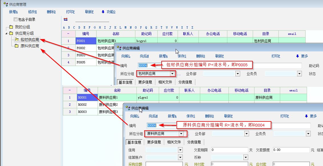 系统提供了供应商分组功能进行了区分,但是系统新增供应商时,供应商编号只是按所有编号记录的最大值进行递增,而不是按不同类别的供应商分类的最大值进行递增,而导致用户每次要针对不同类型的供应商手工修改供应商编号,不够便捷。