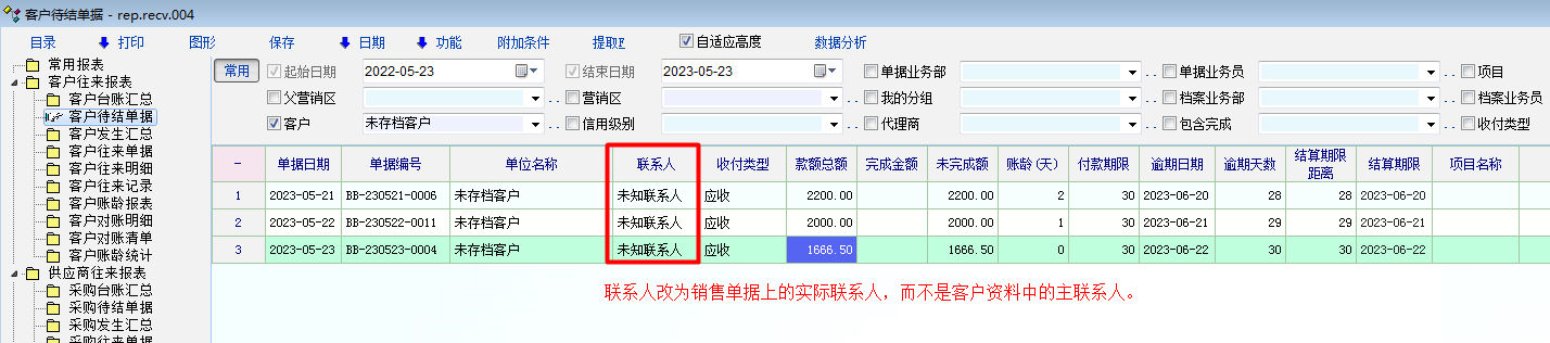 如图片所示,希望改进两个细节。1、待结列表中的联系人能与物资单据中的联系人一致而不是只显示客户资料中的主联系人。2、希望待结列表中可以像对账明细列表一样显示待结单据物资内容。