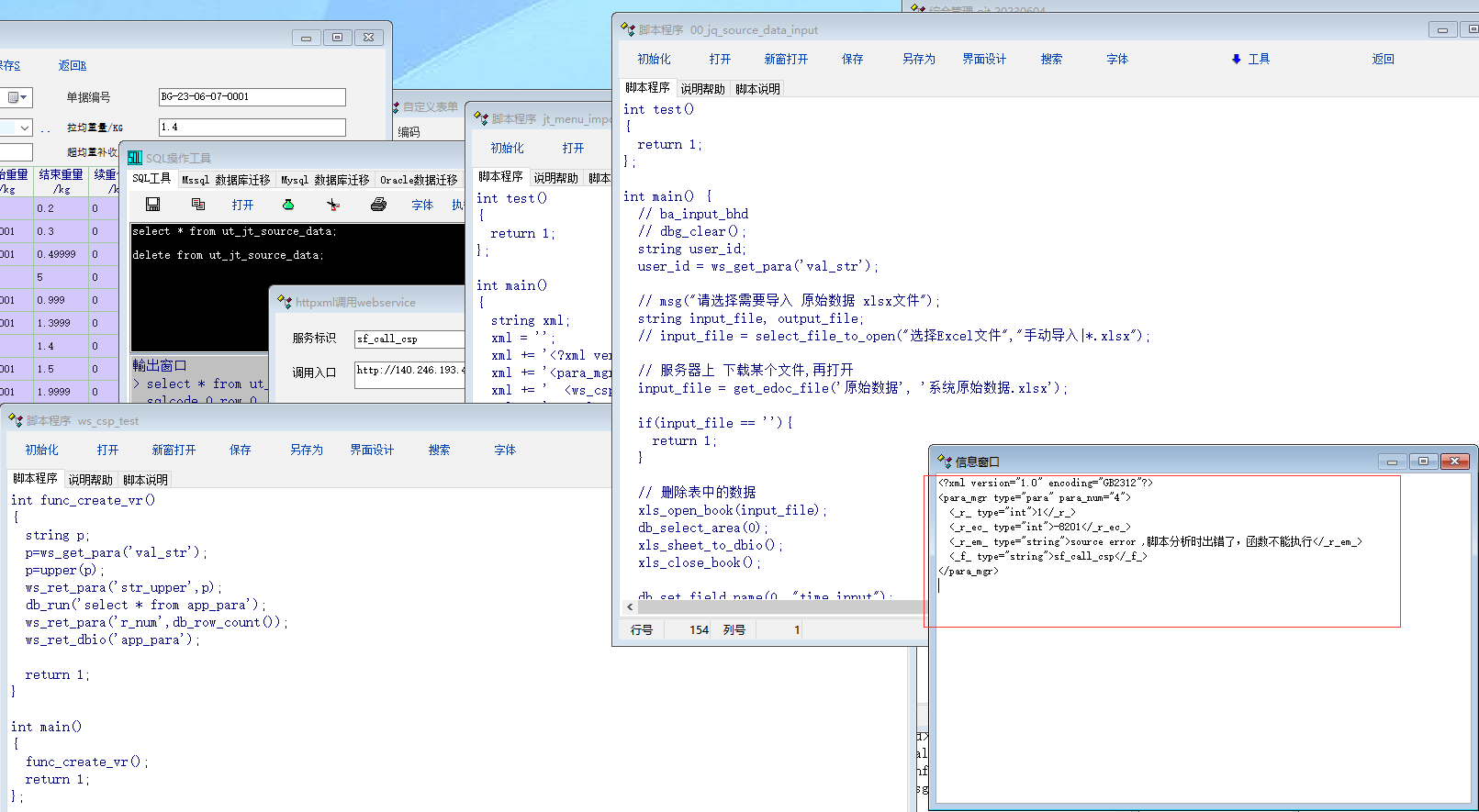 建议 服务器 执行脚本(可以通过单独的一个进程或线程), 目前 服务器执行脚本, 客户端会进行转圈等待, 操作不了客户端(也许导入 资料需要 5-10分钟) 建议 服务器 执行脚本(可以通过单独的一个进程或线程), 目前 服务器执行脚本, 客户端会进行转圈等待, 操作不了客户端(也许导入 资料需要 5-10分钟) 建议 服务器 执行脚本(可以通过单独的一个进程或线程), 目前 服务器执行脚本, 客户端会进行转圈等待, 操作不了客户端(也许导入 资料需要 5-10分钟) 报错 业务场景: 有大量数据(几十万 或 上百万条数据)需要导入到系统中, 通过excel文件. 如果客户端运行导入 , 测数据需要通过网络传输, 可能会丢失或受网络质量影响. 解决方案: 将文件上传到文档管理中, 上传完了之后, 再客户端 调用 脚本, 通过脚本调用 服务器端的脚本, 打开excel文件并导入数据. 测试的时候, 服务端脚本报错. 原因查到是 get_edoc_file 函数引起. 另: 通过观察, 发现服务器程序在执行脚本的时候, 所有客户端都有可能会出现 等待转圈的 现象. 建议可以通过单独的一个线程 或 进程 去执行脚本, 这样可以减少 客户端长时间的等待(也许导入 资料需要 5-10分钟) |