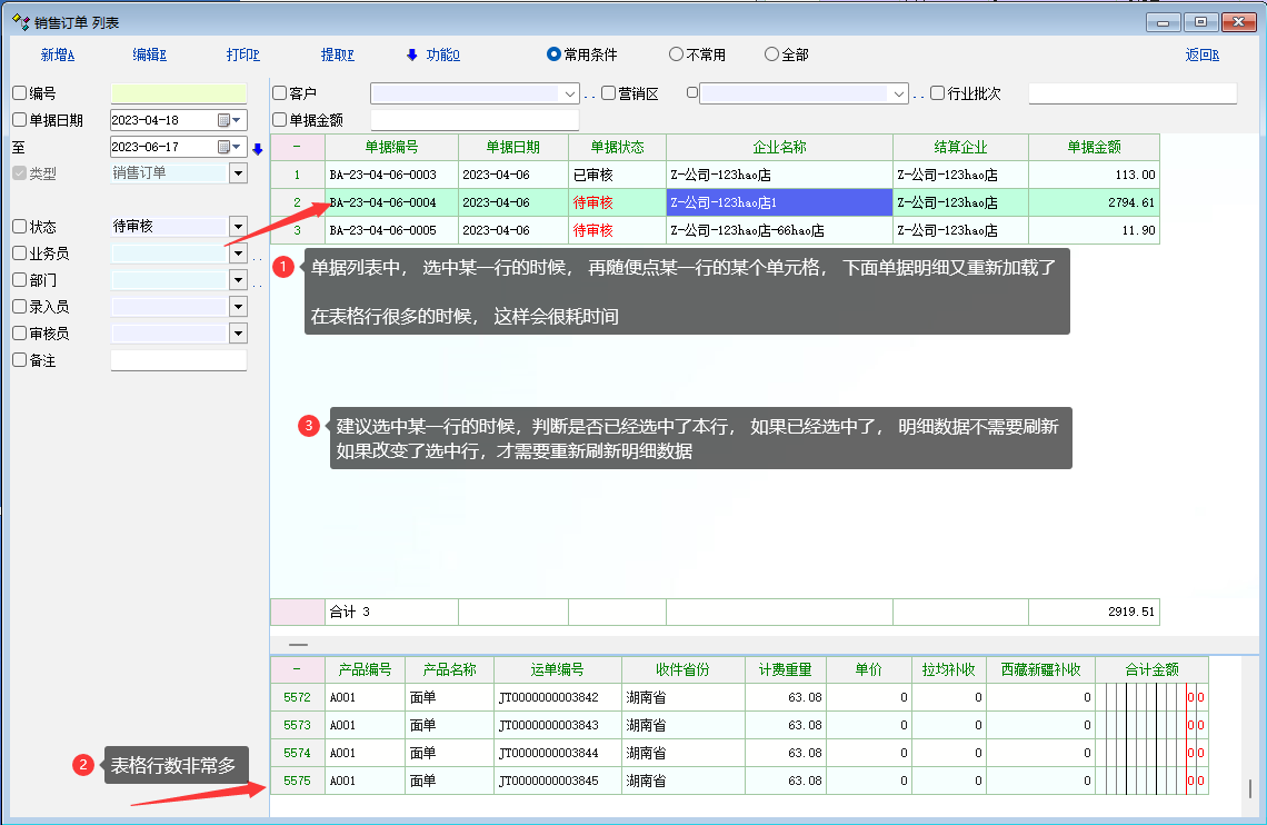 1. 建议 增加1个初始选中行0, 选中行的时候,检测, 是否有改变选中的行, 如果有, 则刷新明细数据;没有则不需要刷新了。