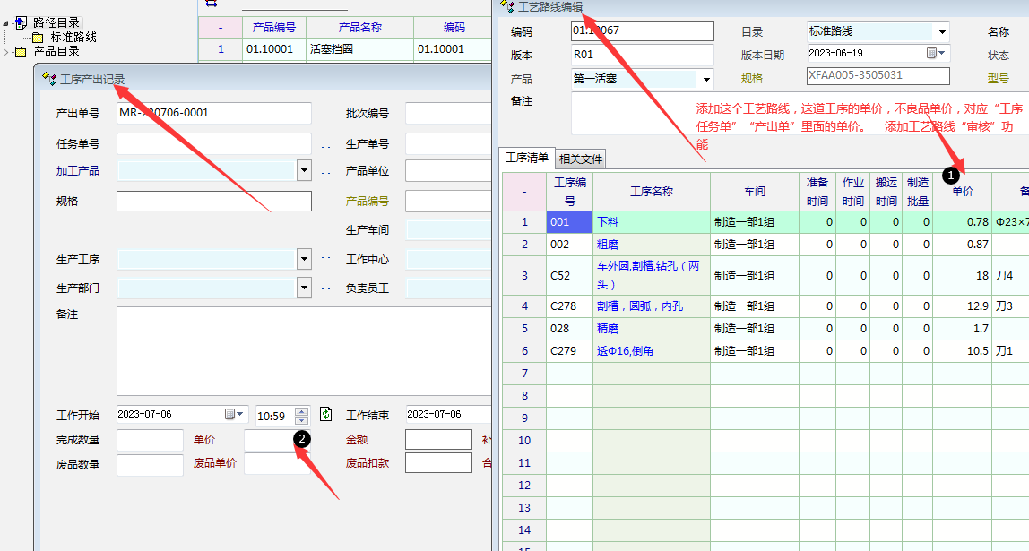 目前急需工艺路线里面添加这道工序的作业内容的单价(合格品单价,不良品单价)功能,这个单价同步“生产派工单”“产出单”上面的单价,以及工艺路线的审核功能