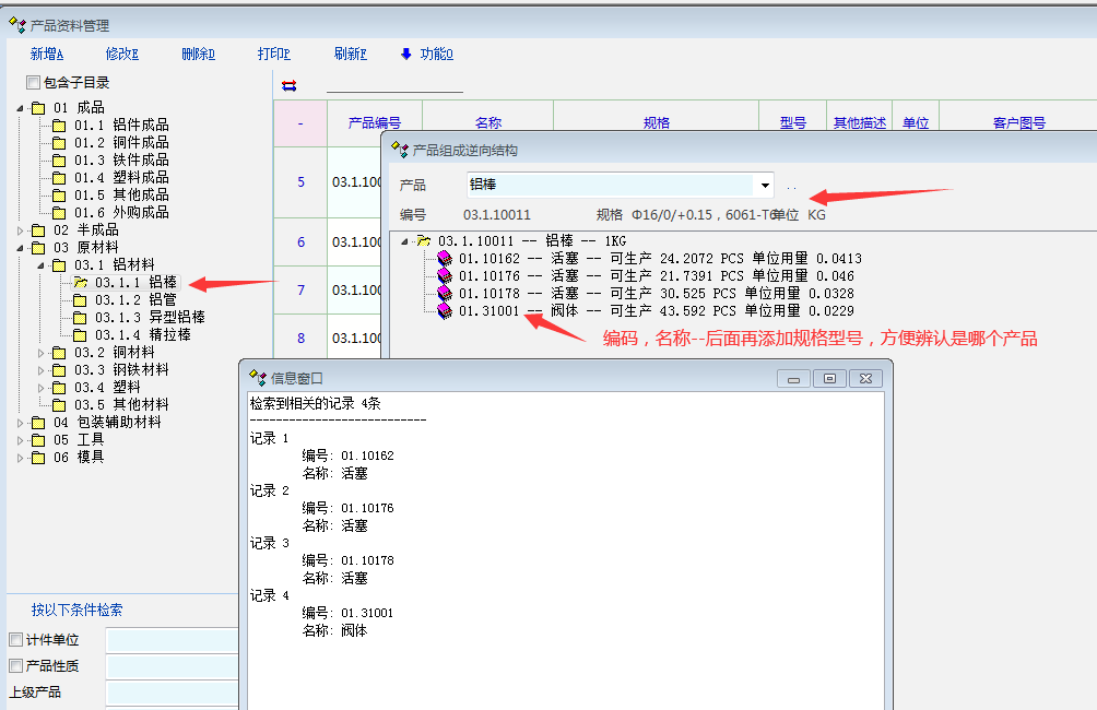 产品资料-----右键“列出组成物资包含本产品的物资”---显示的逆向组成里面,每个产品,名称后面,再添加上规格型号,便于识别是哪个产品(产品多,名称一样的,只有编码,名称,辨认不到是哪个产品)