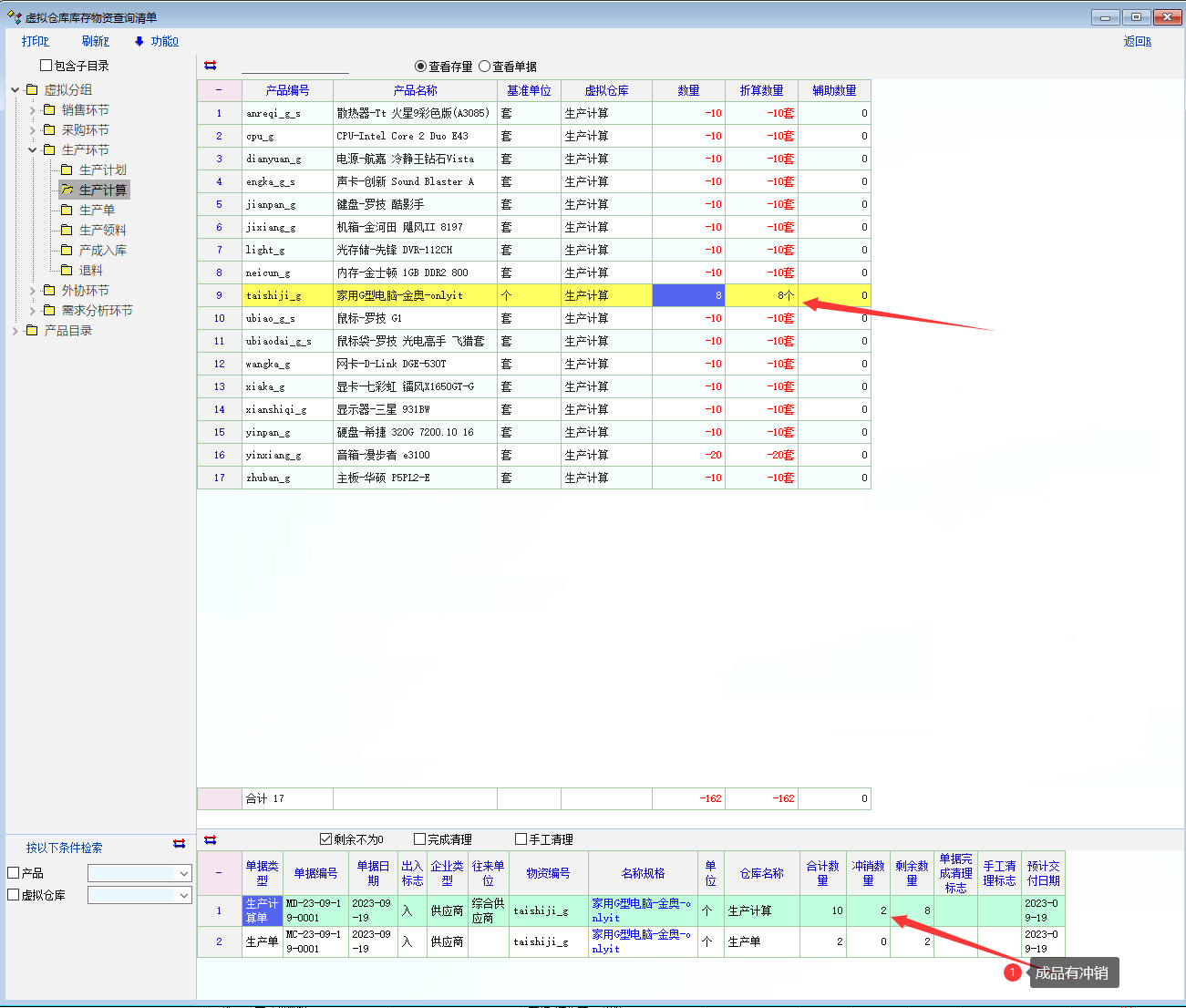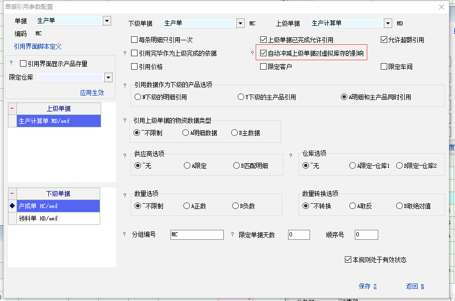 不用管此贴了, 知道 什么原因导致的了. 1 做生产计算单 主产品10个 2 生产单引用或生产计算单中创建生产单 2个 然后看图: 虚拟库存中, 主产品的数量是被冲销了, 总的数量仍然是10个 然后明细物料的数量是没有被冲销了, 明细数量就虚加了2个,总的生产环节就变成-12了. 不用管此贴了, 知道 要点在哪儿了. 就是生产单不能修改主产品数量, 一旦修改, 1 明细就会被重置, 引用关系 就没有了. 生产计算单中的明细被引用数量不准 2 会造成虚拟库存中, 明细物料不能被冲销 |