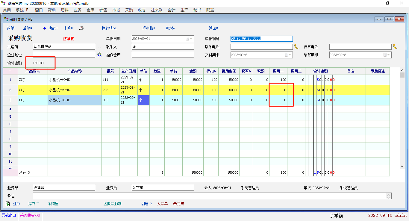 3、发现每录入一个批号(每增加一行),每行合计金额都会多出100元