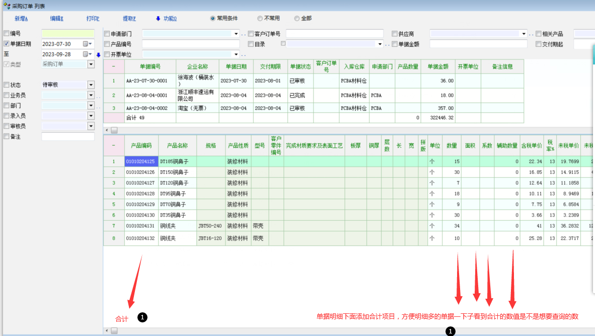 有的单据明细项目很多,引用的适合需要看下明细项目,也会看这些明细项目的合计数值,但目前在列表里面指定的单据,下面显示的明细里面没有合计项目。