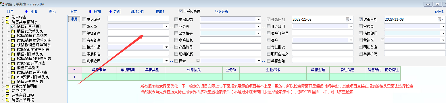系统所有报表检索项目减少,以便系统界面更多的数据展示,直接在单据表格里面多重过滤-(所有检索界面保留时间段设置,其他都可以去掉)------这个多重过滤不要另行跳出窗口去设置检索条件