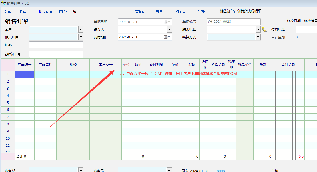1,在销售订单里面,客户有时候修订变更后的产品实际上需要与修订之前的产品需要同时生产,所以在销售订单里面需要选择这个产品使用的是哪个BOM 版本。