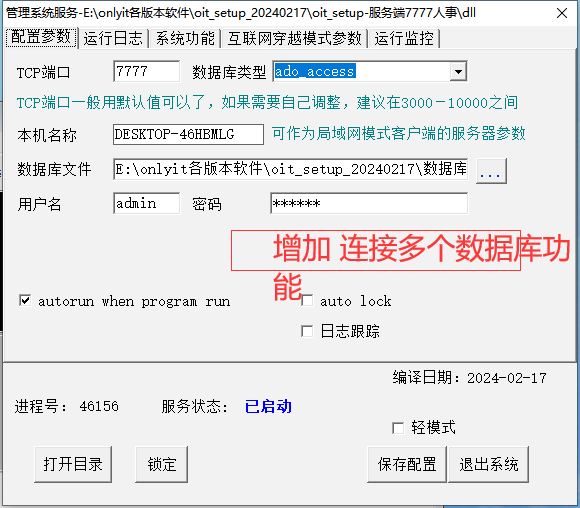 1.客户有MES系统,无对接接口但是开放数据库。Onlyit后台能否支持连接多个数据库功能。这样onlyit通过后台脚本 db_run_ext(连接名,要执行的语句) 直接提取数据库数据 |