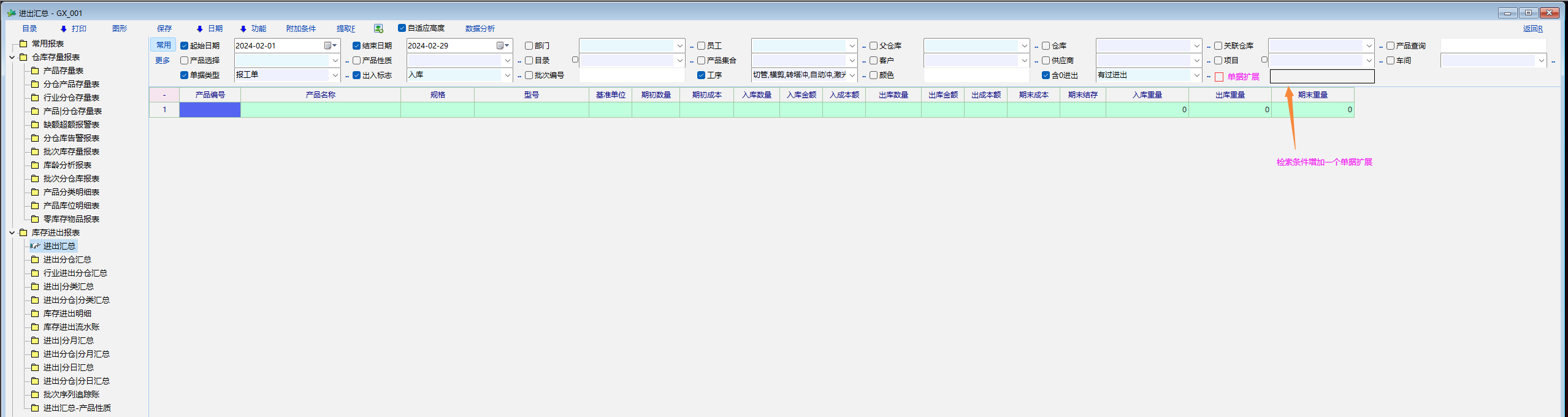 库存报表的检索条件里没有单据扩展,许多时候要用到根据扩展来查询,建议检索条件增加单据扩展,可以直接添加扩展1~扩展8,也可以直接按照扩展的名称。更进一步的话,可以添加附加扩展检索条件,这样会更方便一些。