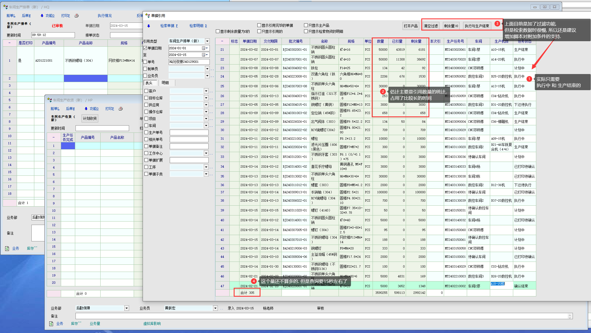 应用场景: 当引用时, 需要查询很长一段时间的数据, 数据量非常多, 很大一部分数据是不需要的, 这时可以利用sql提取的附加条件,减少检索的数据量, 精确提取出想要的, 需要的数据. 实际案例. 客户使用业务单据 车间生产排单, 车间生产收货. 生产收货引用生产排单, 但是需要引用的数据是: 每天机台中正在执行中的, 和生产结束的. 一些排单下去 计划中, 或者未执行的排单数据是不需要查看的. 时间跨度会比较长, 因为有些产品量大, 排单生产周期可能会是三个月或半年. 这时候检索数据量就比较多了. 如果能使用脚本, 定义sql的附加条件, 类似于在报表中, 可以写脚本, 增加附加条件. ------------------- 在引用脚本定义中, 增加before_load_data函数, 可以使用 类似 rep_set_tab_lmt 定义附加条件. rep_set_tab_lmt SS 设置附加条件参数, 这个函数只在before_load_data函数里使用, 用于在提取数据前根据表名设置相应的条件, 只有在报表有附加条件按钮的时候才有用, 支持的表名可以点开附加条件定义 查看看限定对象支持的列表。 ------------------- 就能精确地找到自己想要的数据. 提升工作效率, 减少等待的时间. 因为每天都要操作几次收货的. 每次引用现在需要等待15-20秒左右(查询3个月的单据,如果更长时间, 会耗时更长). 下图是客户实际使用单据: |
