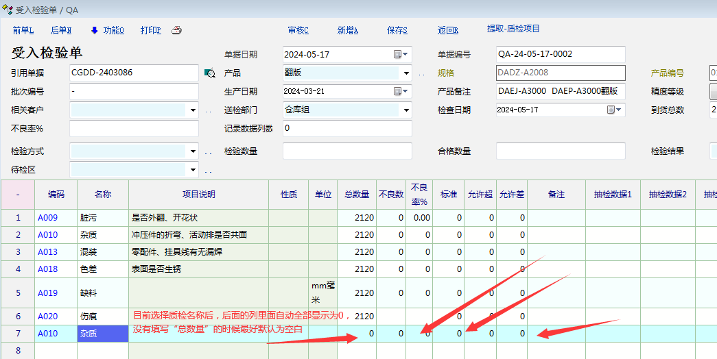质检单据里面质检名称填写后----后面的列不要自动默认填写0,因为质检单据一般为仓库发起后打印出来,后续再由质检人员对产品检验完成后,在单据上填写结果。全部自动填写为0的话,后面填写不便