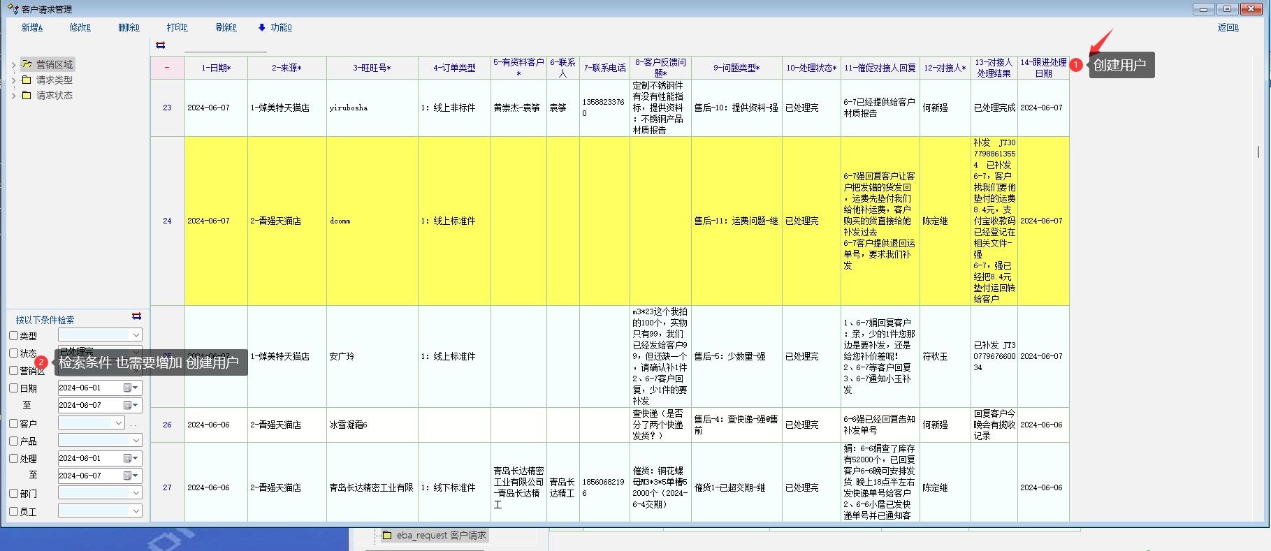需要添加 create_user_id, 这样每个操作员,很容易查找 和自己有关的 客户请求, 目前处理到什么进度了。