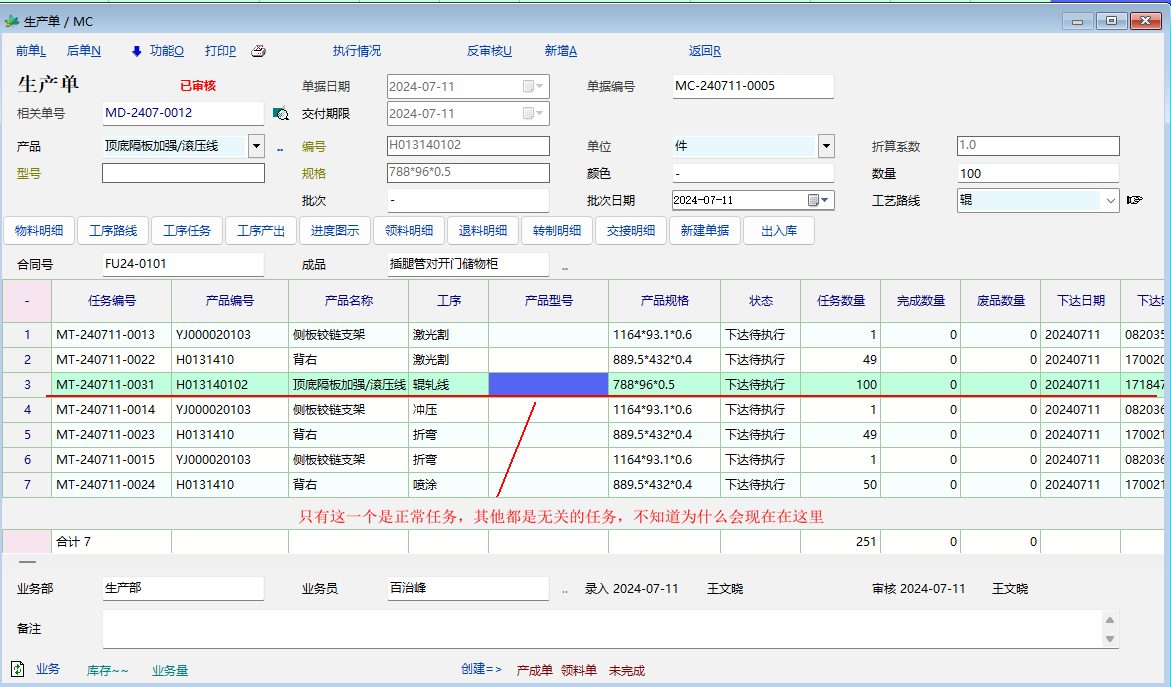 最近发现生产单审核后,产生的工序任务中会出现与生产单无关的工序任务,不知道是什么原因造成的,几乎都个都需要手工删除。