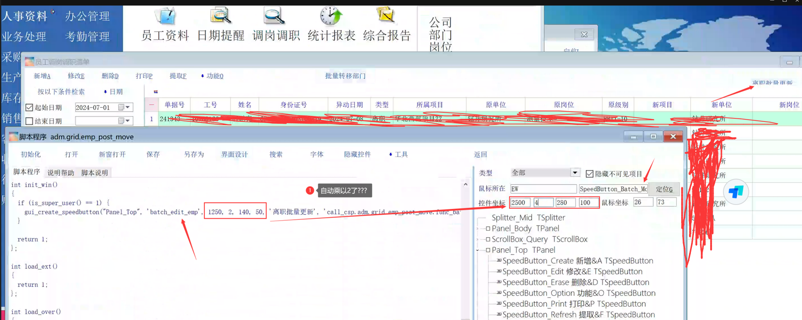 调岗调职列表脚本中, 增加了一个按钮, 发现按钮实际的位置和大小, 刚好是脚本中设置的2倍, 不知道具体原因. 请看 截图 |