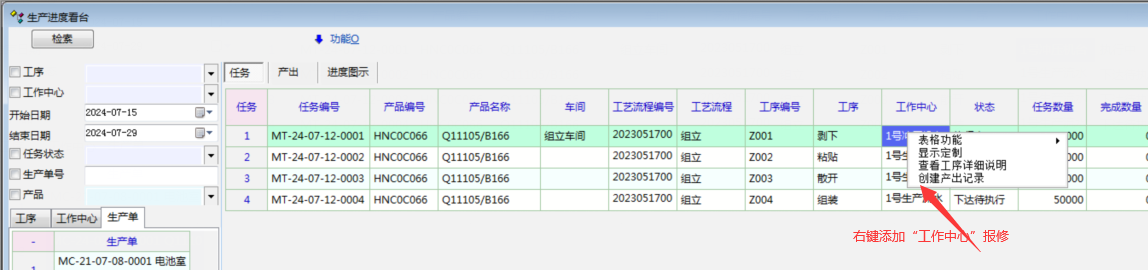 在工序任务里面,右键添加这道工序的设备“报修记录”,自动打开资产检修记录,自动添加这台设备的信息,添加报修记录。