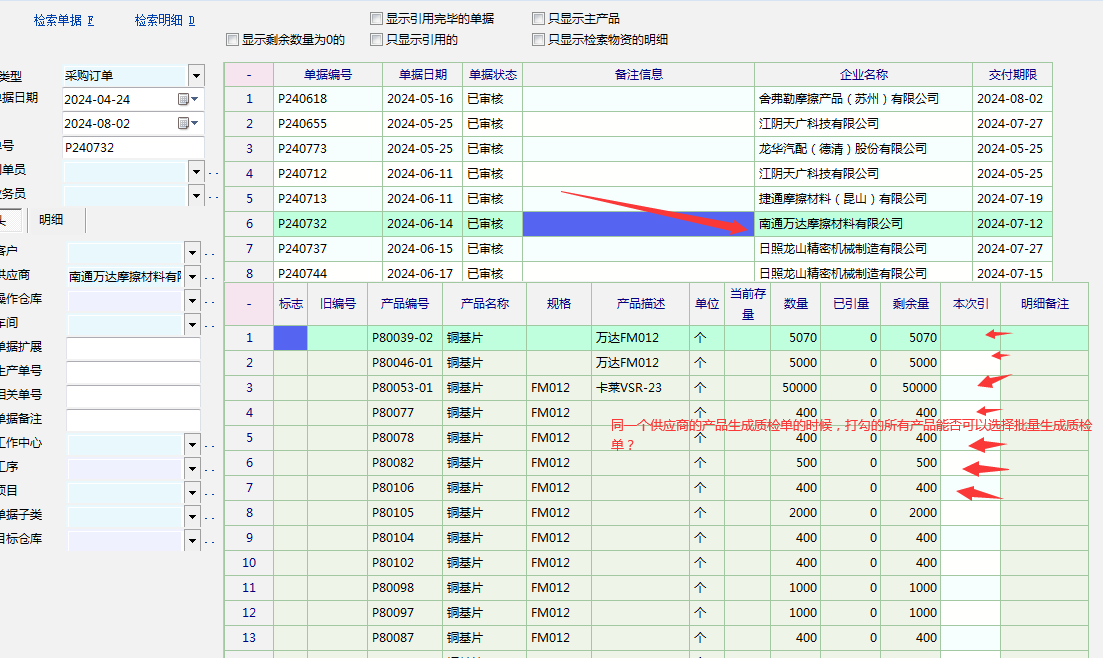质检单问题----做质检单据引用采购订单时-同一个供应商,同一张采购订单的时候选择多个产品能否批量生成质检单据?