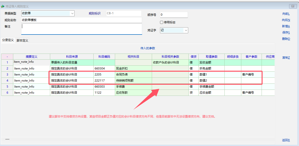 单据引入会计凭证时,某些项目金额正负值不一样时对应的借贷方向也不同,但是目前的脚本中找不到有关借贷方向的设置,建议增加支持。