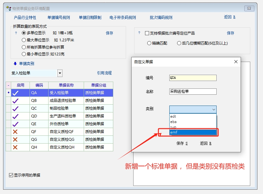新增标准单据用作质检单,类别里没质检类。