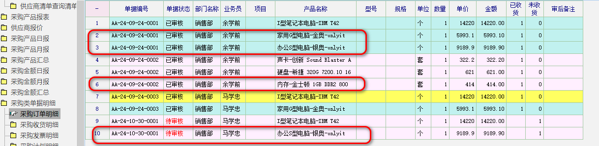 任意三张采购订单,每一张单有一部分物品已处理了,