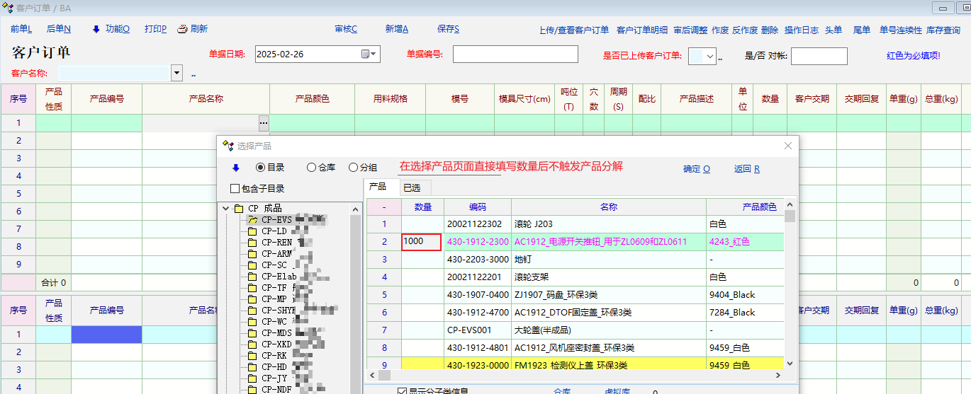 不建议在客户订单进行产品分解,这涉及到2到3部门工作职责