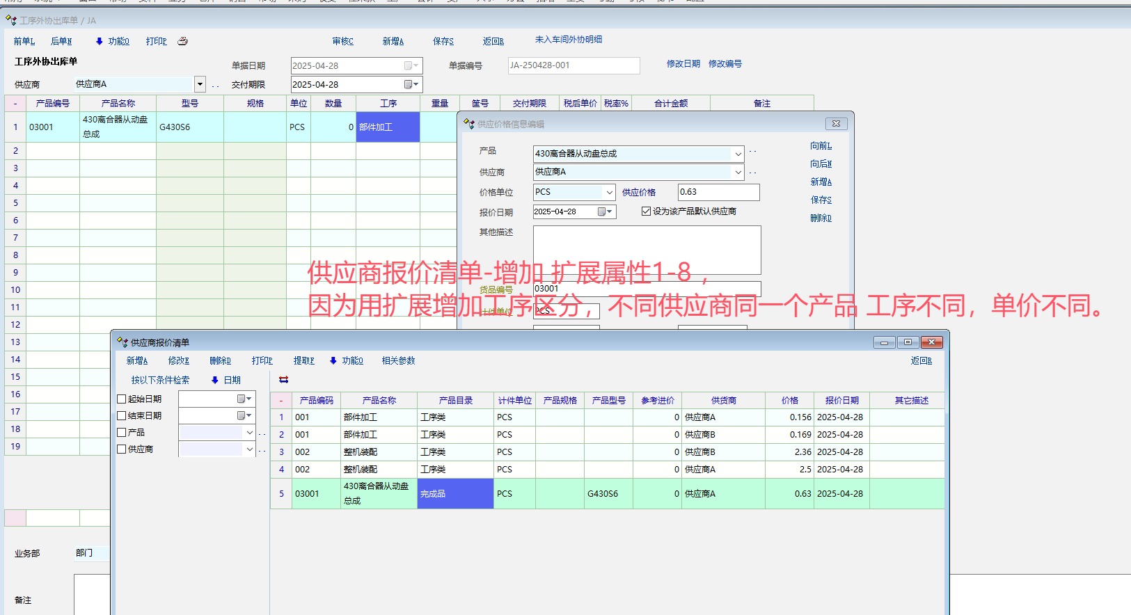 供应商报价清单-增加扩展属性1-8 ,因为用扩展增加工序区分,不同供应商同一个产品 工序不同,单价不同。