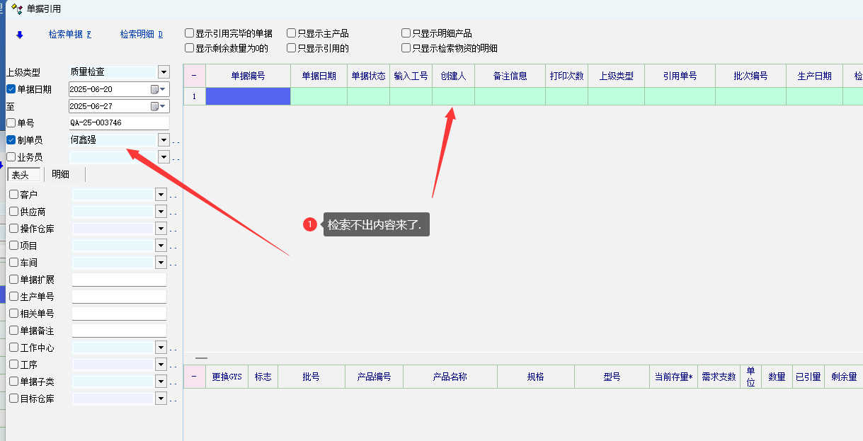 引用界面中, 选择 创建人 检索某个用户创建的单据时, 不出单据,