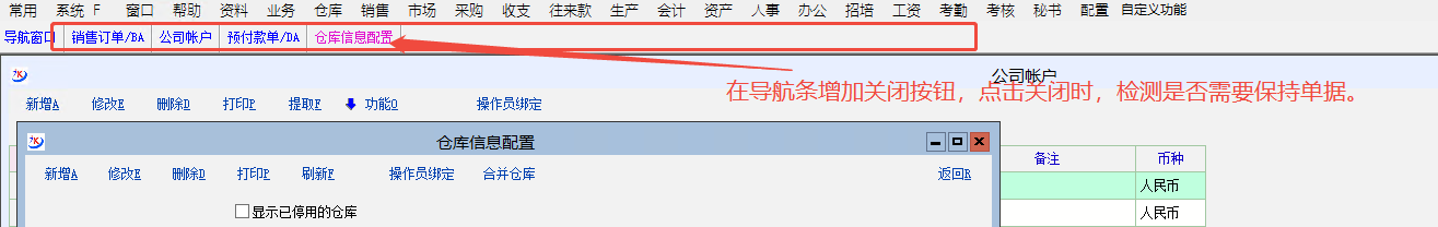 优化改进:直接在快速导航条处,增加关闭按钮。关闭时,自动检测单据是否需要保存。需要保存的再弹窗提示。 详见图示