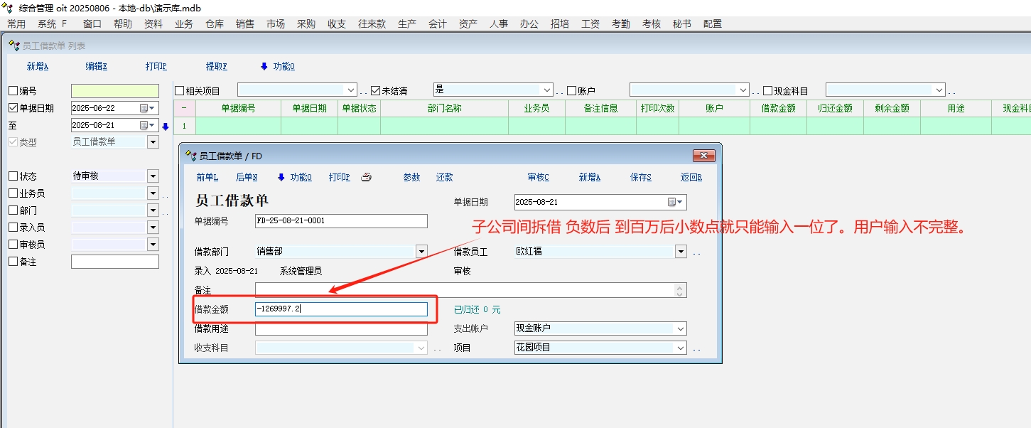 子公司间拆借 负数后 到百万后小数点就只能输入一位了。用户输入不完整。