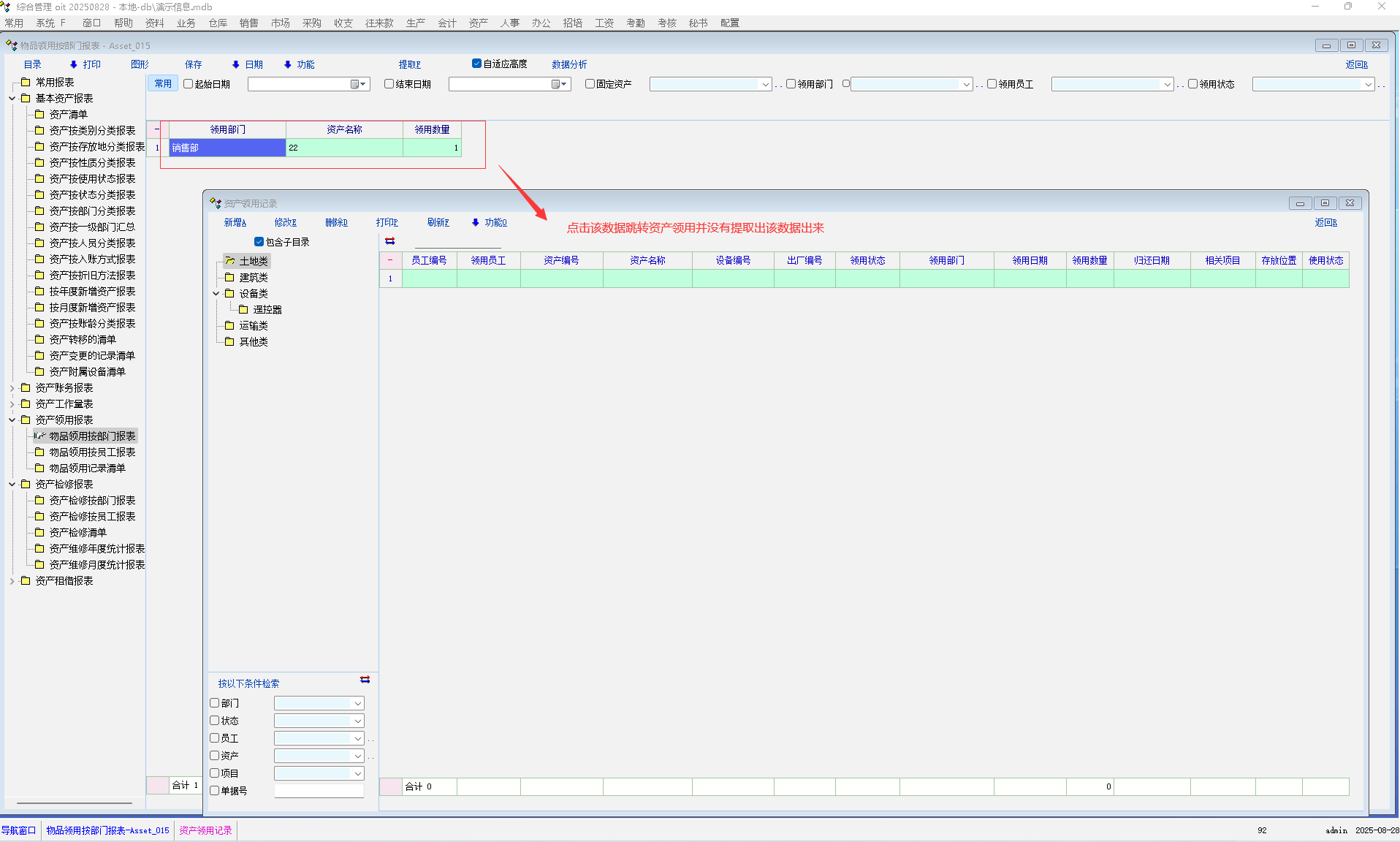 2:物品领用按部门/员工报表提取数据后点击数据跳转异常