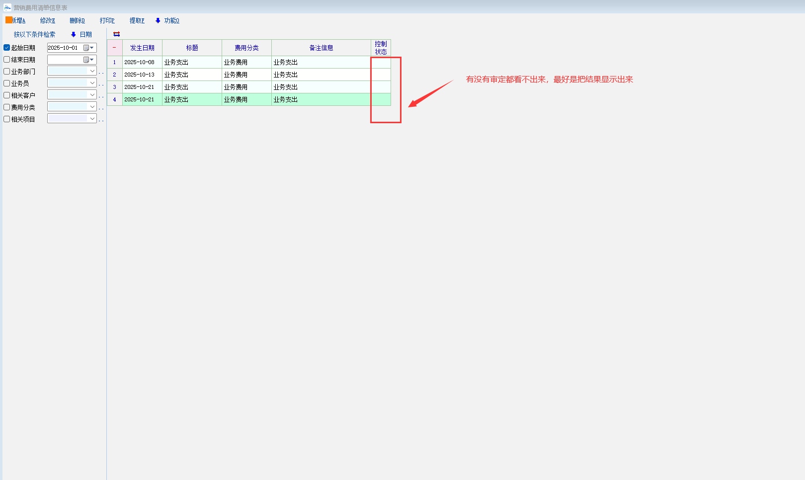 营销费用列表应该把控制状态显示出来,以方便分辨是否已经对该数据审定