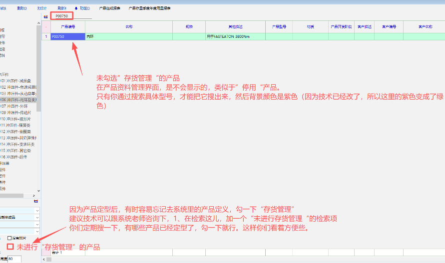 产品资料检索栏添加:为进行存货管理选项,方便及时查找哪些产品未进行存货管理。