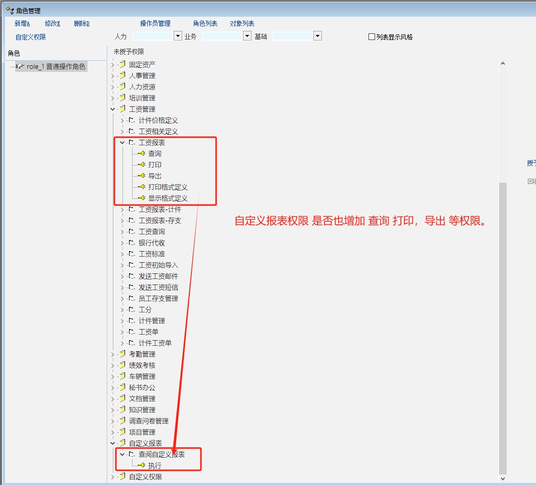 自定义报表 -权限里增加 查询 打印 显示定制等权限。