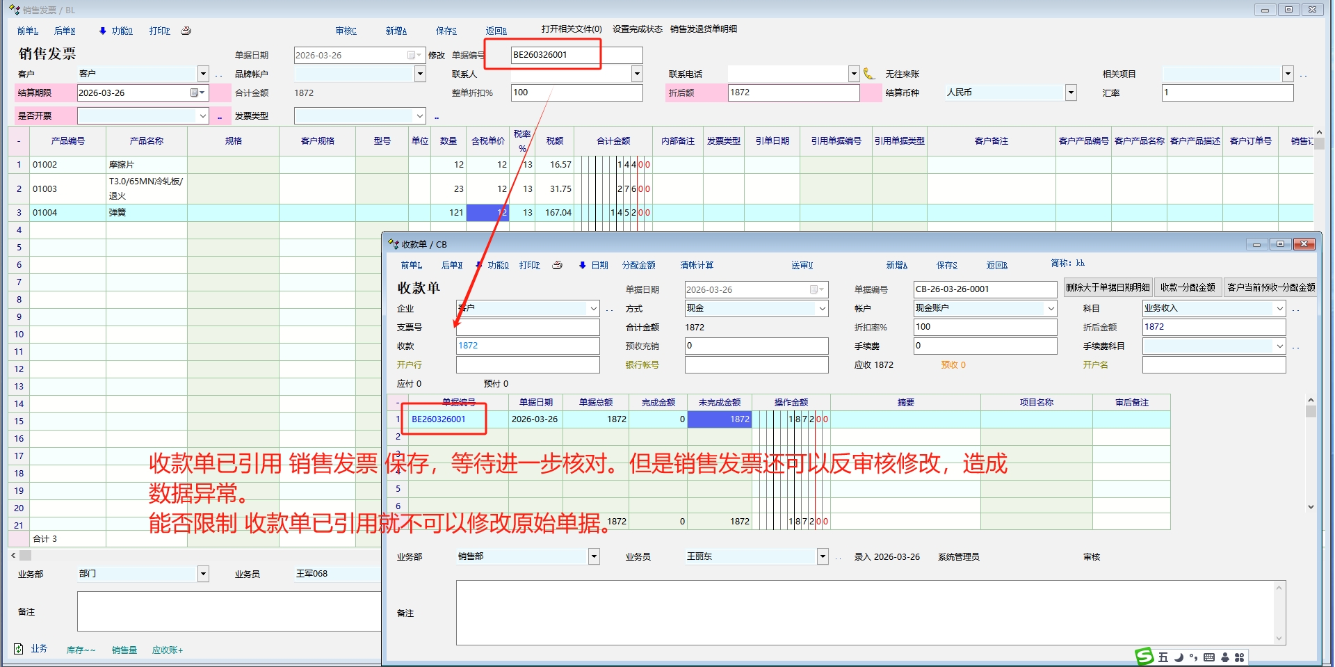 收款单没审核时销售发票可以反审核,再去审核收款单会提示错误。孟老师现在是这样的,这就造成财务反向要去重新核对业务。正常是业务要修改单据,发现被财务已做了收款单,业务找财务先把单据删除一下。 |