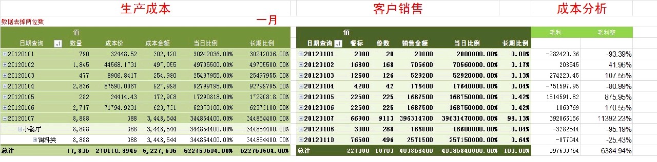 我现在在餐饮企业工作,成本分析模块的作用主要在于分析当天生产原料(比如大米金额)占当天总生产原料的比例,占当天营业额(收入)的比例,可以分类统计,形成报表。我现在急需这样的一个模块。