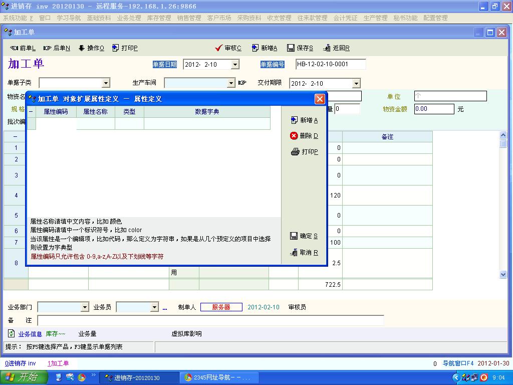 單據對象屬性擴展:指單據表頭. 單據明細擴展:指單據內的細目內容. 如單據表頭想增加一些內容: 1.點選"操作"->參數及配置->單據對象屬性擴展, 屬性編碼設"01",屬性名稱設"部門代號",類型設"整型". 按確定重啟後.在單據表頭中即可看到部門代號的欄位可自行輸入資料. 2.按"F3"後,左邊檢索條件,中間會有一欄"部門代號",即可輸入資料作搜尋. |