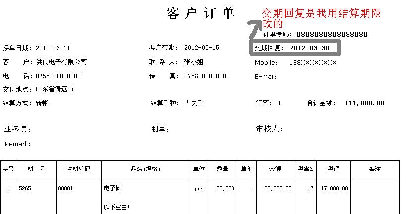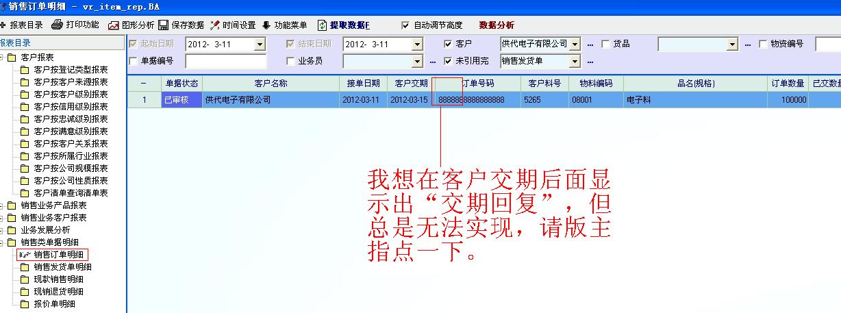 现在的公司在接到客人的订单时,客户会有一个交付期限,但往往很多企业都很难正常达到其交期,故我在销售订单中想添加一个实际交付期限,可能是学习不够,一直无法实现,所以将就将结算期限改为了----交期回复;可是在销售订单明细中又显示不到这个“交期回复”这个字段,不知是我的方式不对,还是软件本身的局限,故发贴求助,请版主指点。万分感谢!附件有二个截图,一个是销售订单的,一个是销售订单明细的;