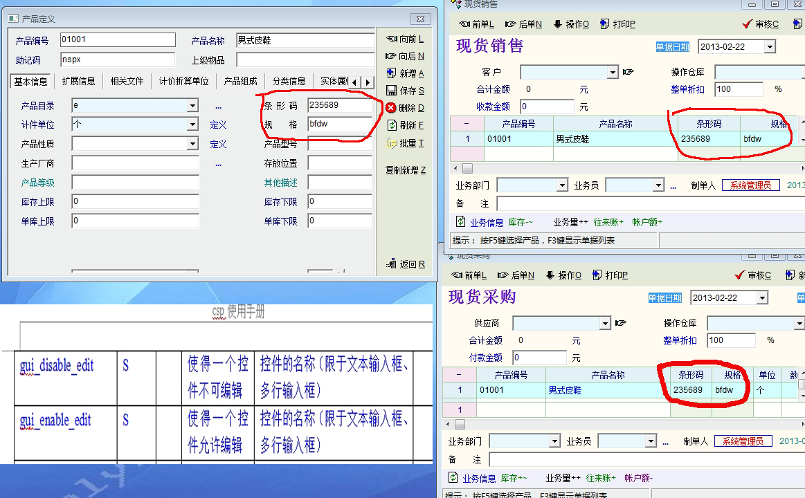 向论坛中高手求助:我看到软件中可以用脚本编辑修改单据中的某个控件里的内容。我现在想在(现货销售+现货采购)单据里直接修改(条形码)和(规格)里面的内容,请会用脚本的大师帮助我,谢谢。