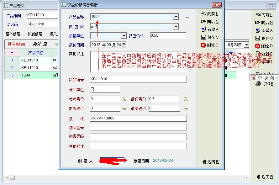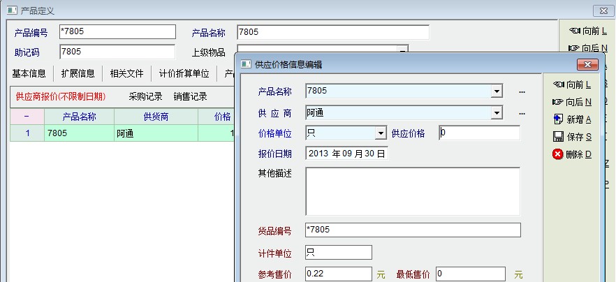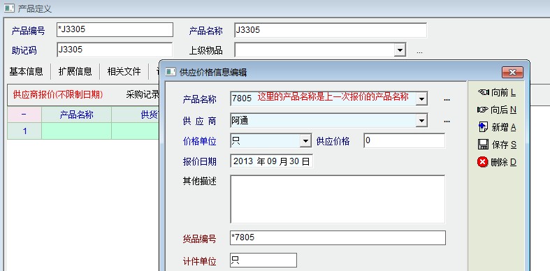 20130928版本的产品报价仍跟以前差不多:打开A产品的产品定义编辑界面,新增A产品供应商报价记录,然后退出,打开B产品的产品定义编辑界面,在B产品定义新增供应商报价记录,这时供应价格信息编辑界面中的产品名称仍然是A产品而非当前产品B。