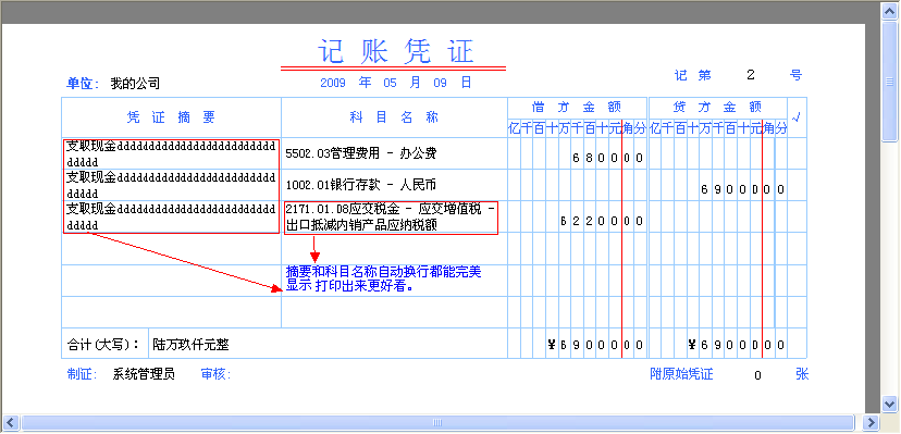 摘要和科目名称自动换行后都能完美显示