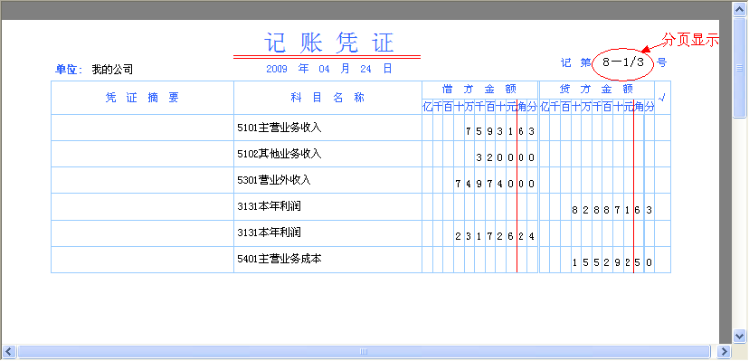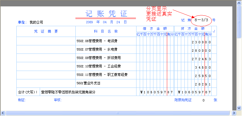 加入的分页的显示,合计处加上了大写金额,看上去此模版更接近真实的会计凭证。