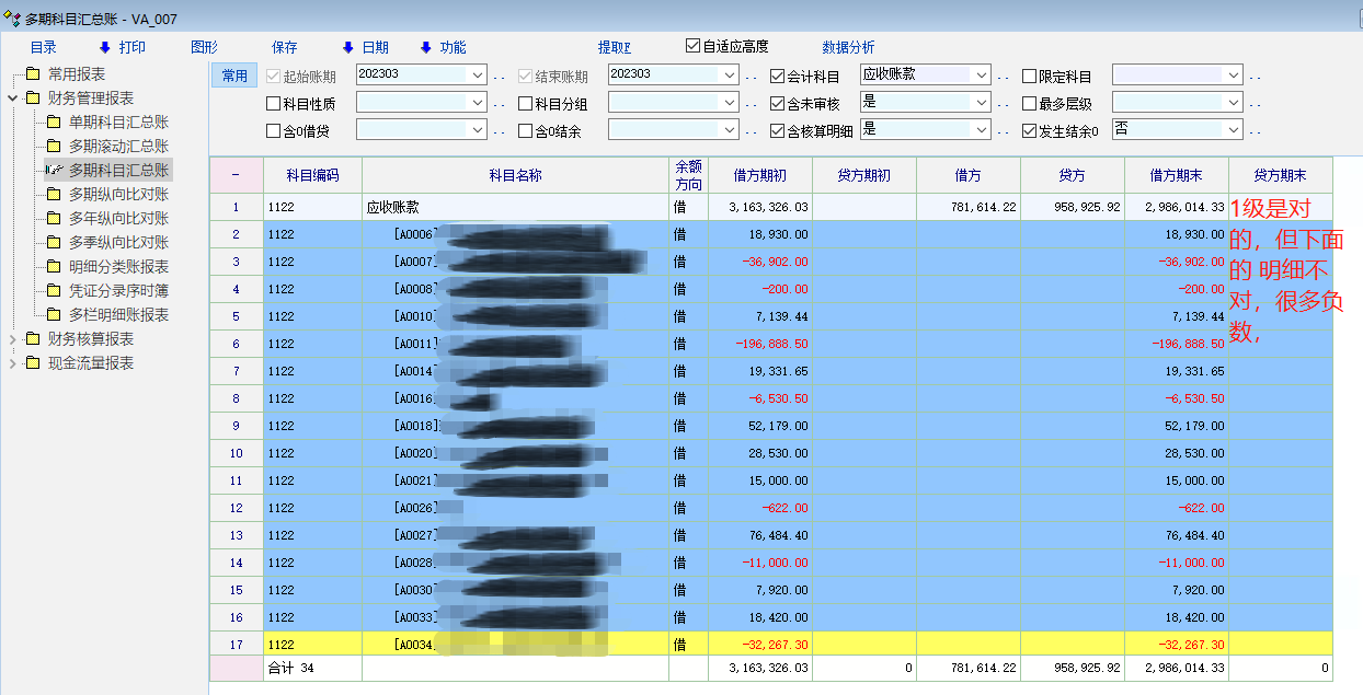 在勾选会计科目为应收账款,勾选含核算明细查询时,明细结果与1级合计不一致。