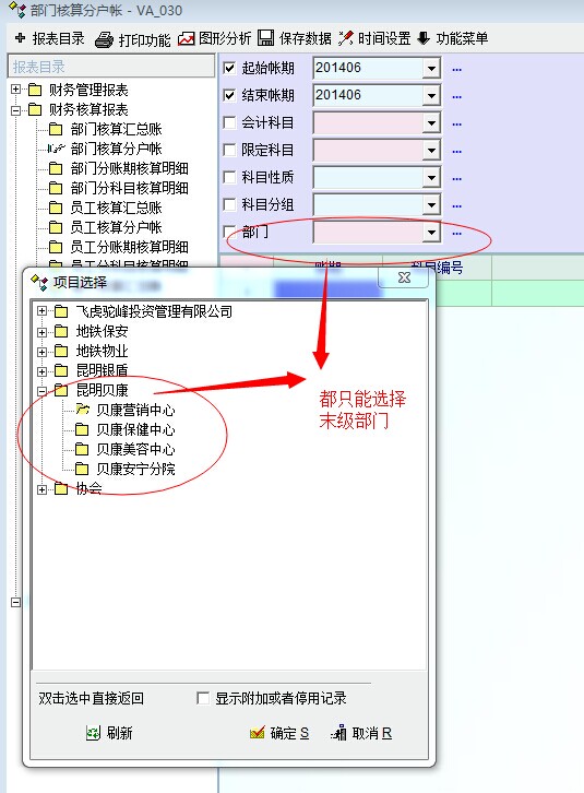 科目里设置了部门辅助,可以出分部门的科目汇总账。但只能出最下级部门的,不能出二级部门的。比如公司有 A,B,C,D几个部门,A下面有A1,A2,A3,A4几个部门,现在可以查询出A1,A2,A3,A4的部门核算汇总帐。但不能查询A部门的核算汇总帐或者分户账。