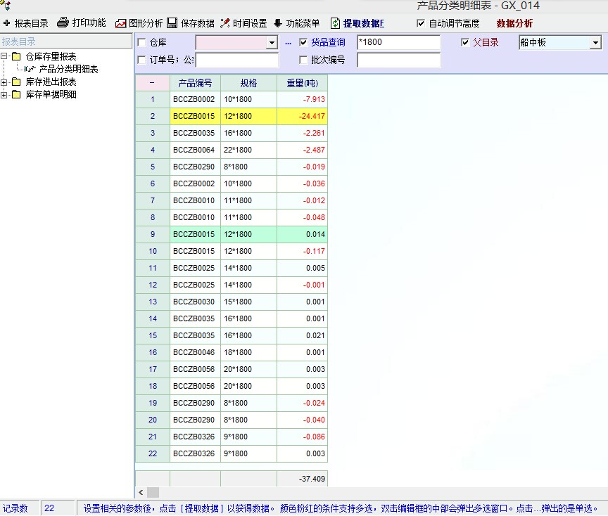 1、库存报表中查询该目录产品有22个产品有库存状况(包括正负库存),请看库存报表图