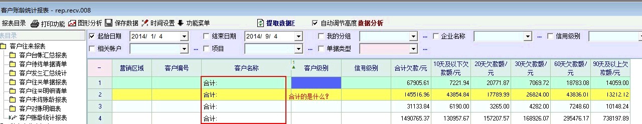请问客户账龄统计报表中的几个合计项合计的是什么内容?有什么意义?