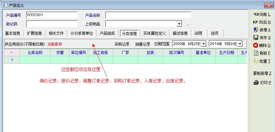 建议老师增加这些功能,在产品定义、编辑界面中应该能非常方便、快捷的查询得到关于该产品的所有单据、资料!